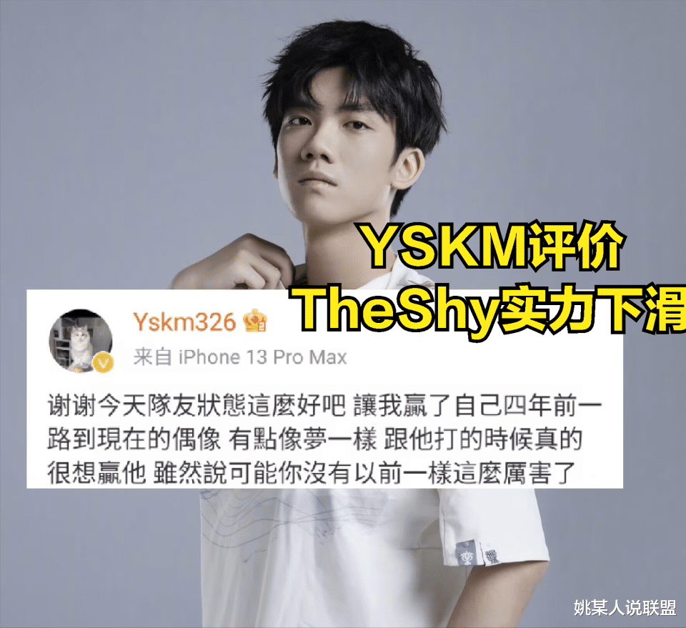 在IG战队成功以2场碾压击败WBG战队后,IG战队的上单选手YSKM也是在自己的社交账号上面庆祝,同时对WBG战队的上单选手THESHY表达了自己的敬意,表示THESHY是自己偶像,只不过在评价TheShy实力上面却遭到了很多LPL观众的嘲讽,因为YSKM竟然在发文当中认为THESHY实力下滑。