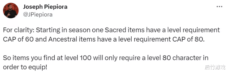 《暗黑破坏神4》掉落装备的需求等级绑定角色等级,这一设定将成历史。来自游戏副总监Joe Piepiora的消息,未来的第一赛季,装备的掉落等级将被固定化。