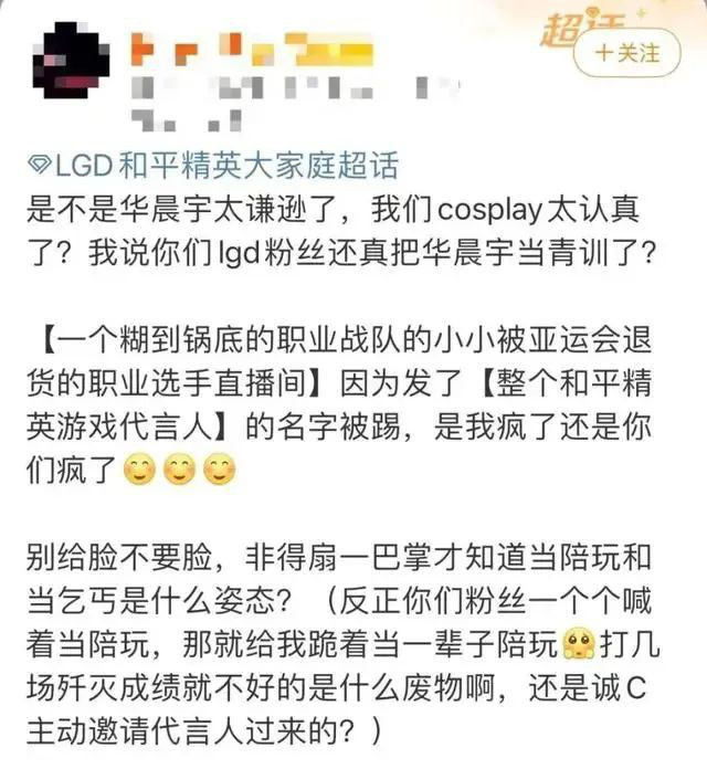 LGD队员诚C遭到了华晨宇粉丝的疯狂辱骂,LGD队员凌杀因为花傲天的上场而被迫让位,引发了凌杀粉丝的不满。更进一步的,华晨宇粉丝称LGD队员是华晨宇的“陪玩”,进一步放大了不同群体之间的矛盾,这对于本就需要破圈的PEL电竞生态来说,是一次不小的伤害。