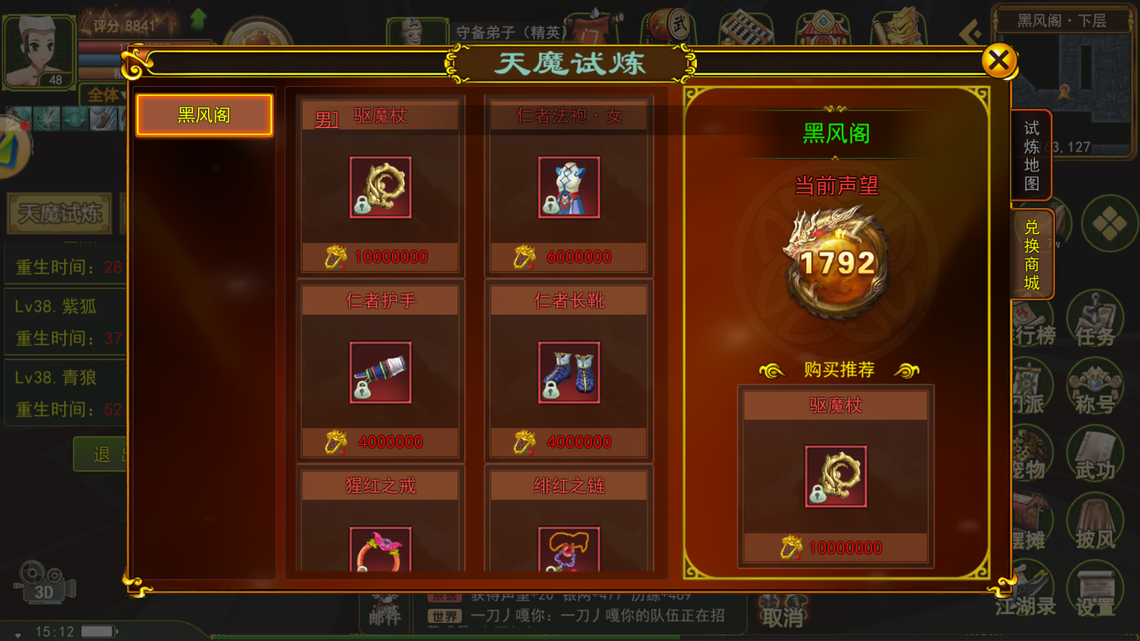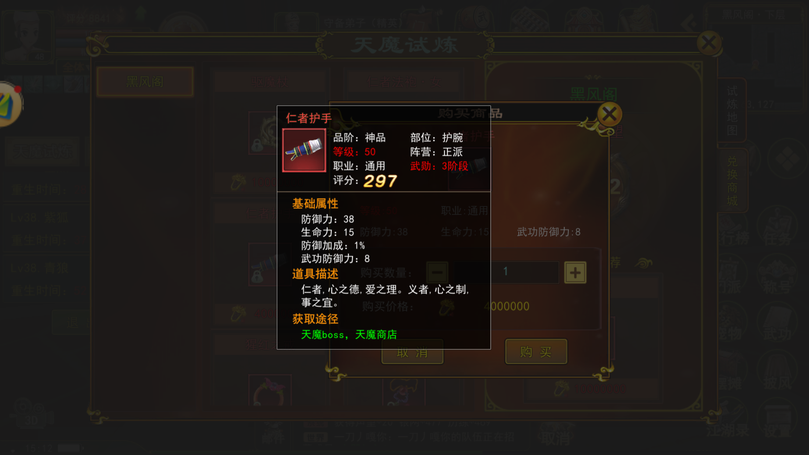 其次,天魔试炼新出了一个兑换商城,你可以用声望值在兑换商城购买装备(装备都是武勋装备)。在击杀天魔试炼中的野怪会获得声望值,不同的声望可在对应的天魔商店中购买装备道具。注意,天魔试炼不同系列副本的声望并不通用。