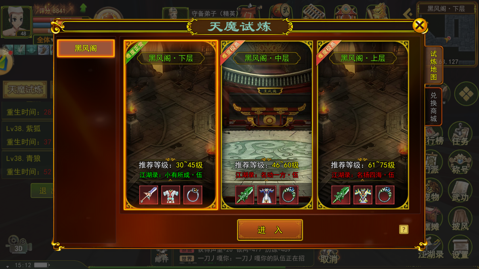 1. 你的江湖录必须达到“小有所成·伍”才能挑战黑风阁·下层,达到“名动一方·伍”可以挑战黑风阁·中层,达到“名扬四海·伍”才能挑战黑风阁·上层。