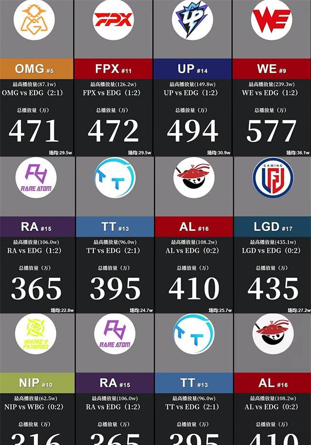 考虑到JDG拿了春冠、msi冠军,热度高也正常。倒是全华班BLG不像我们想的那么风光,比赛总播放量在七百多万,场均只有45万,只能说是一般水平。要知道热度最低的队伍也有三百万观看量,BLG只比他们高一倍而已。