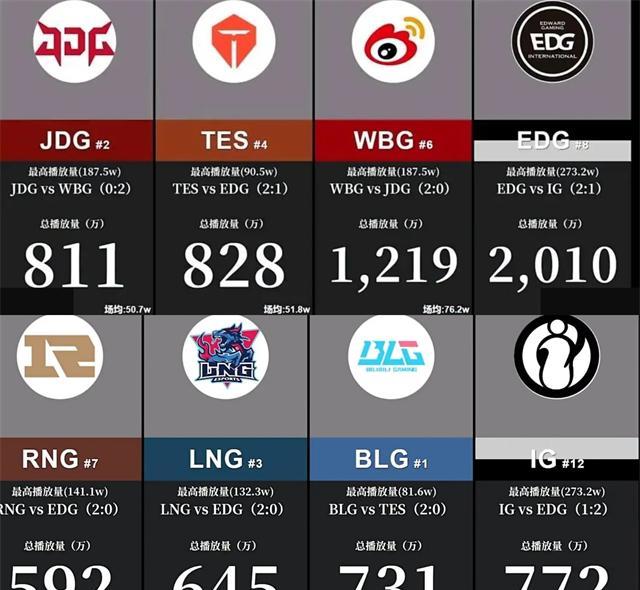 所以我觉得流量队伍也有“大小王”,EDG断层领先。当然这不仅仅是战队的热度,乌兹作用很大。他加入后第一场打的是IG,比赛精彩EDG还赢了,观看量肯定很高。EDG加乌兹热度很高,其他队伍就不那么乐观了;第二名WBG有一千多万的观看量,场均76万,差不多只有EDG的一半;第三名TES是828万,成绩更好的JDG排名第五,比赛观看量比TES还低一点。