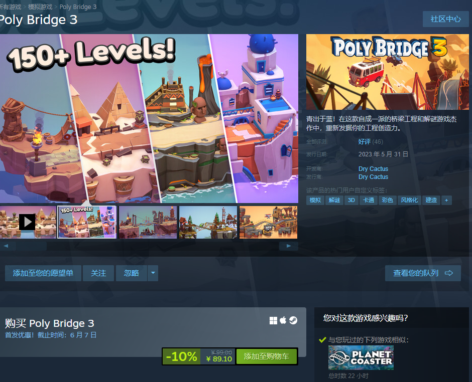 新西兰游戏开发商 Dry Cactus 今天(2023 年 5 月 31 日)在 Steam 上发布了最新系列《桥梁建造师 3 》。支持中文在 6 月 7 日之前,您可以以 89.1元的价格购买它并享受 10% 的折扣。