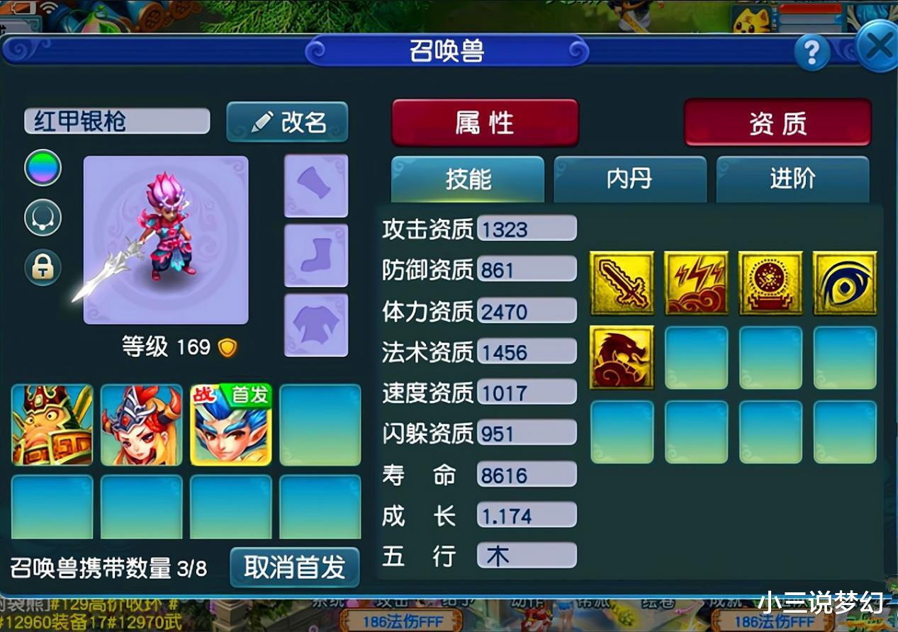 别看上面的这只召唤兽的技能数量少,上面的这只召唤兽中使用时所打出去的输出数据却不低,这是一只拥有者出其不意、风起龙游和善恶有报三个特殊技能的蛟龙,带高级偷袭的套装就可以将输出给拉满,不过使用这种召唤兽的时候红蓝秘制是必须得开启的,要不然这种召唤兽的续航能力特别差,而且因为没有高级吸血的原因,这种召唤兽只能在抓鬼等低难度的战斗中使用。