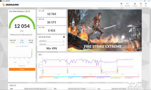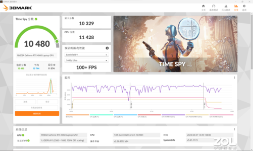 在3DMARK的测试中,FireStrikeExtreme模式下显卡分为12765、在TimeSpy模式下显卡分为10329。从两项测试来看,RTX4060的性能与RTX3070的性能属于同一水平,表现还是比较不从的。