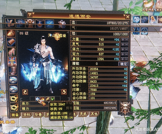 先来看一下面板:血量20万,外功攻击2万,命中2.3万,闪避7590,会心攻击159,会心防御101,冰攻击2847,减冰抗189,减抗下限14!