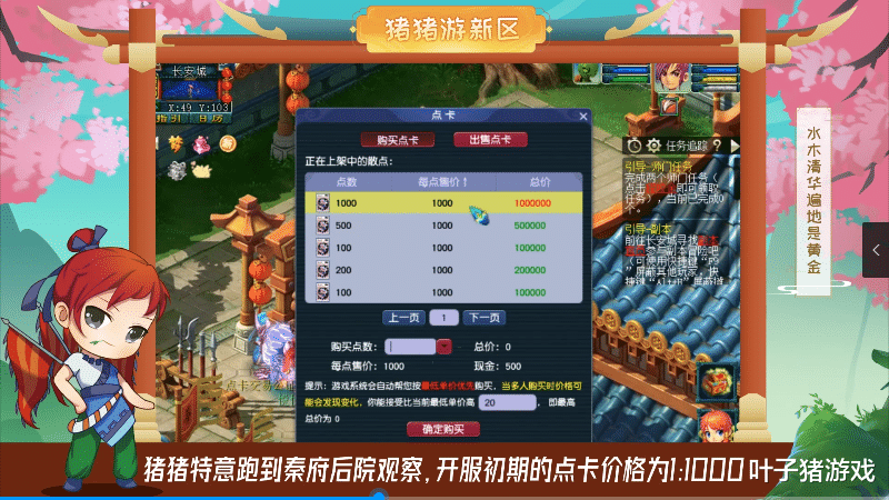 对于想致富的小伙伴来说,最关心的就是【北京三区】水木清华的“点卡比例”。猪猪特意跑到秦府后院观察,开服初期的点卡价格为1:1000,即10点点卡=1万两梦幻币,同其他新区的无明显差异。