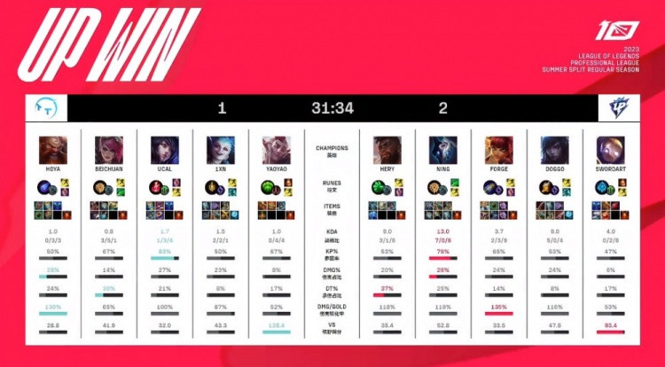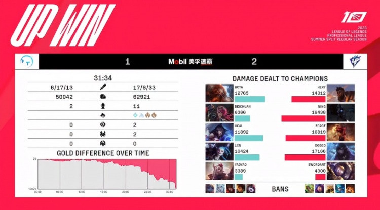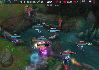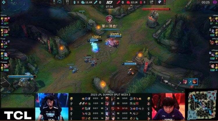 [20:58]UP去开小龙,TT侧面过来开团,千珏开R也没保住金克丝击杀安妮,但金克丝被奎桑提黏住后击杀,双方打出1换1,UP回头收掉小龙听牌土龙魂。酒桶落单被厄斐琉斯击杀。UP经济领先3K。
