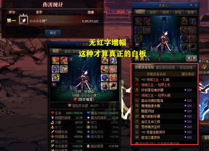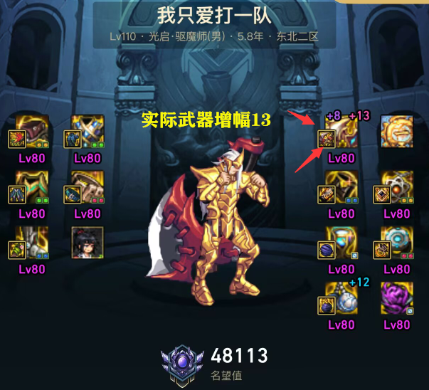 而东二梦想的驱魔,武器这个部位,却增幅至红13。但凡角色身上,拥有一件红字,那么就不算“纯白板”。正因为这一点,导致东二梦想驱魔,自诩“白板”,从而引起玩家热议。