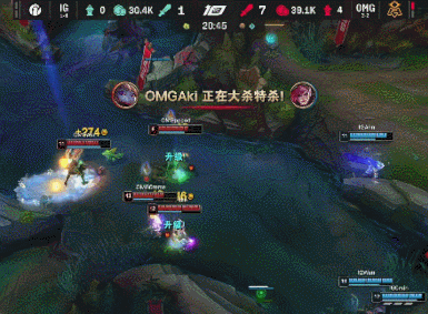 [20:20]派克野区眼上蹲被洛抬起后,小炮收掉人头,OMG回头去开大龙逼团,iG过来加速游戏,波比收掉蔚,诺手先杀安妮再杀霞拿到二连击破,OMG正面收掉大龙,经济领先来到1W。
