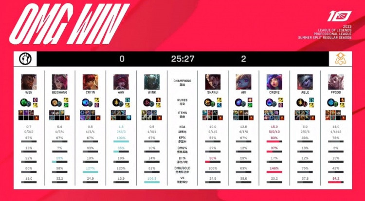 第二局前期Aki波比完美带动节奏,先锋团Creme妮蔻完美进场拿到双杀,OMG打出0换4拿到3K经济优势。中期Wink野区被抓,OMG回头开大龙逼团,iG接团却送shanji德莱厄斯双杀,OMG收掉大龙经济优势来到1W。后期OMG破掉iG三路,轻松推平iG基地拿到比赛胜利。