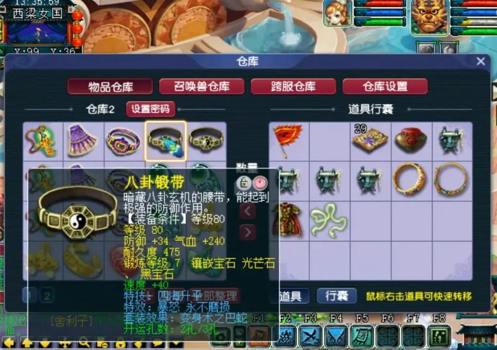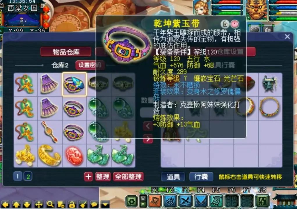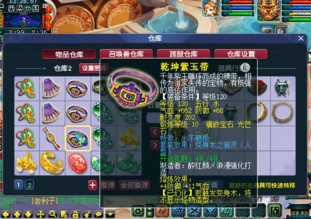 腰带的配置有两套,一套是7段的修罗傀儡妖套装,另外一套是上了10段光芒石的猫灵套装,都熔炼了防御与气血属性。