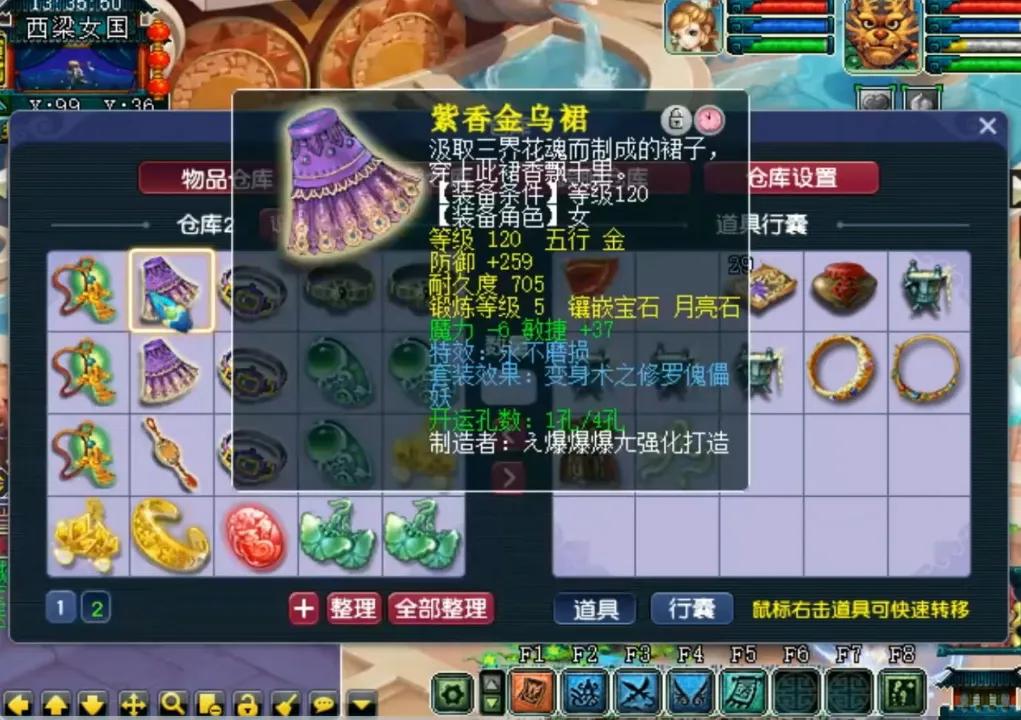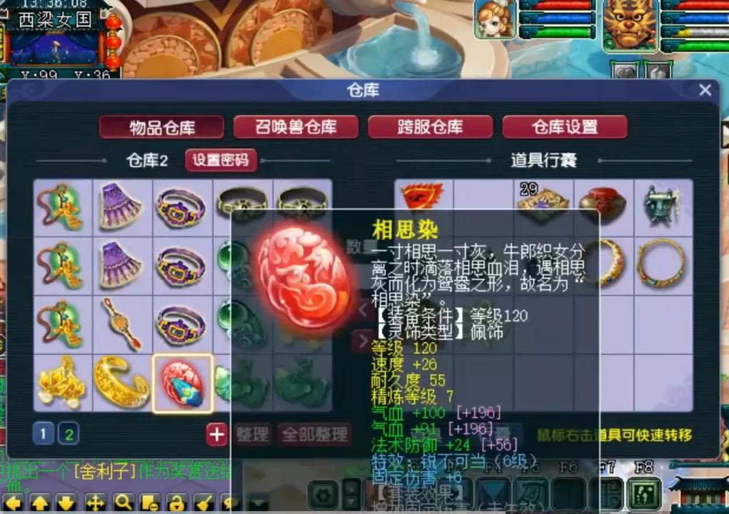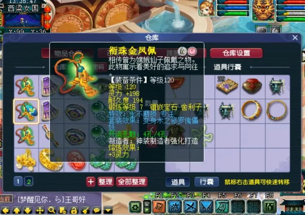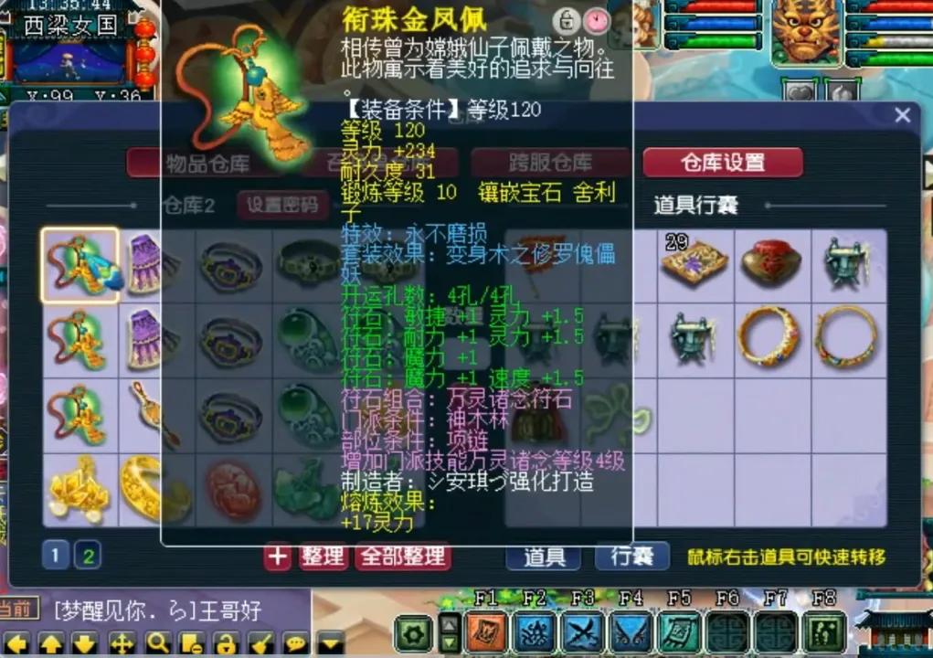 先来了解一下项链装备的属性,配置了清一色的永不磨损特效,宝石上了7-10级不等,点化了套装效果修罗傀儡妖,开满4孔,熔炼灵力达到了17点。