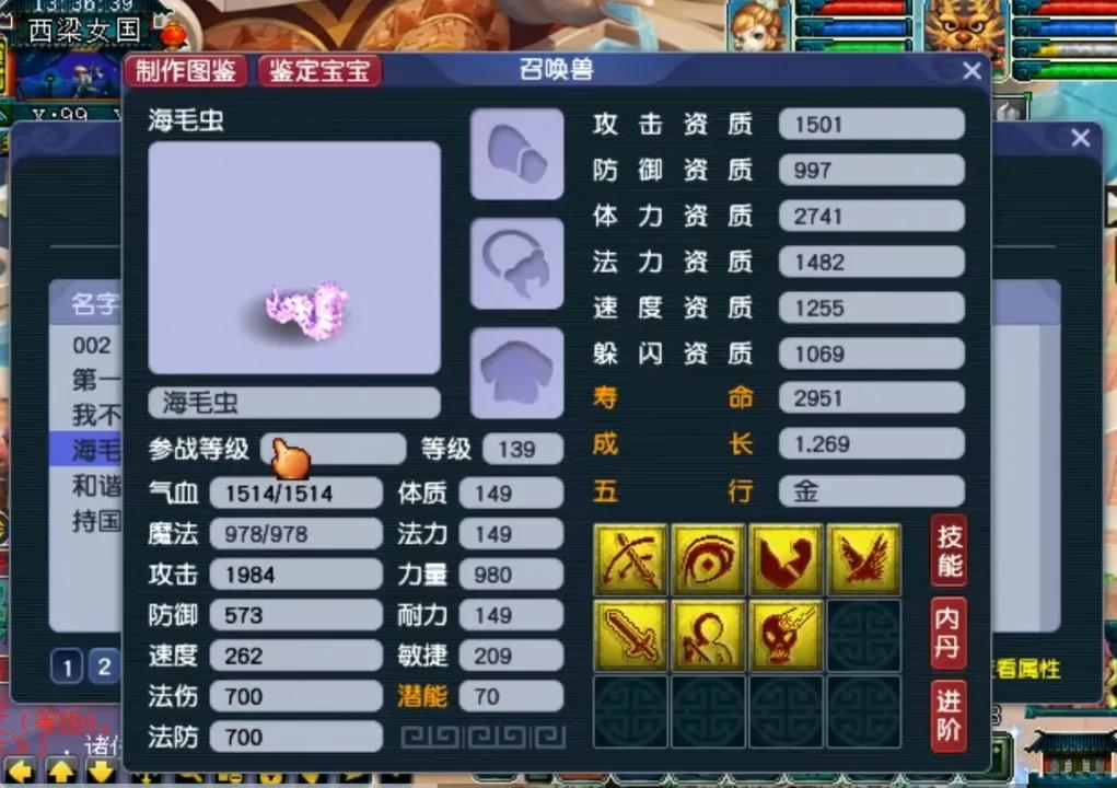用实力说话,抓鬼专用宠也要整得花里胡哨的,打造了一只7技能个性海毛虫,攻击达到了1501,成长1.269。