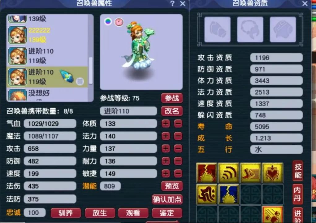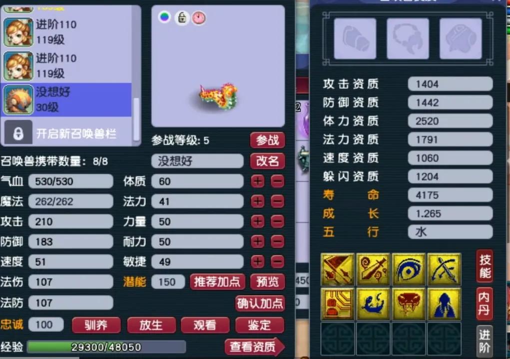 目前这位五开玩家的手里还有一只个性海毛虫,虽然没有特殊技能,但总技能达到了8个,攻击1404,成长1.265,妥妥的全力攻宠胚子一枚。