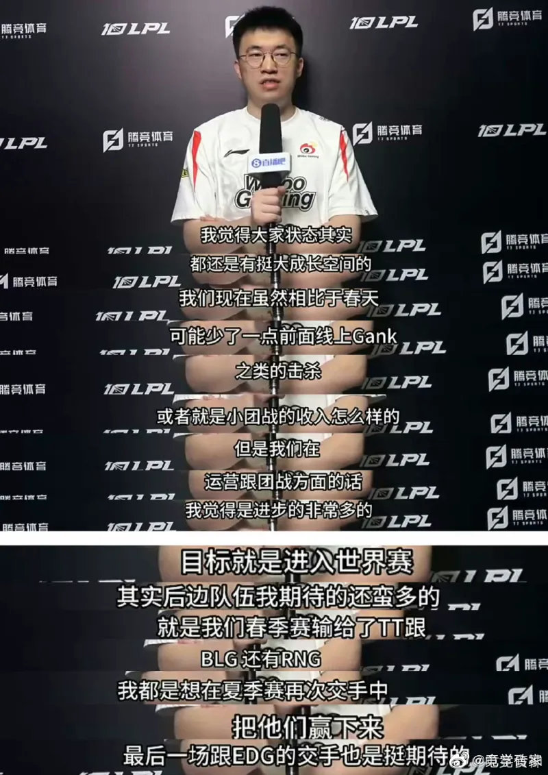 xiaohu:大家的状态其实还有挺大成长空间的,队伍相比春天少了一点前期线上gank击杀或者小团,但我们现在运营跟团战方面进步的非常多。今年的目标是进世界赛,后面要交手的队伍想把TT,BLG还有RNG都赢下来,最后一场打EDG也挺期待的