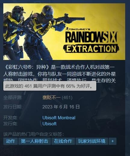 育碧推出的合作射击游戏《彩虹六号:异种》已经在6月16日登陆Steam平台,目前本作Steam评价褒贬不一,461条评价中66%好评。