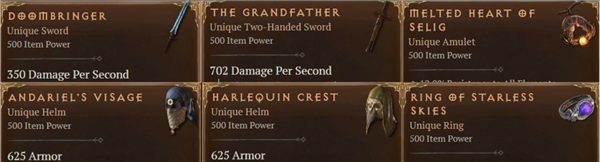 除了安达莉尔的仪容以外,还有其他5件非常稀有的暗金装备,包括上面提到的“谐角之冠(全技能+4太强大了,最高20%的伤害减免也很不错)”,以及“末日使者(最高20%几率攻击触发范围暗影伤害)”、“塞利格的溶解之心(能量槽增加30%,受到伤害时会用能量代替生命减少)”、“无星夜空之戒(减少核心技能能量需求,减少量会根据使用次数叠加,最高40%)”和“祖父(最高增加100%暴击伤害,且武器其他属性Roll点上限比别的武器更高)”。