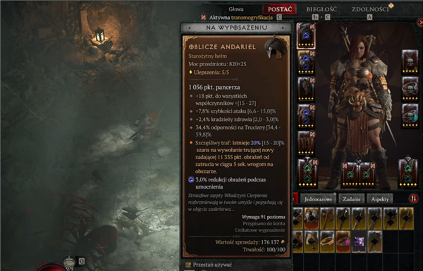 在片段的6分30秒开始,Lithie展示了安达莉尔的仪容所拥有的能力。这件头盔的特殊效果是“幸运一击:在一定几率(最高20%,他很幸运地Roll到了最高)下触发一阵剧毒新星,在5秒内对区域内所有敌人施加X点毒素伤害。”其他的副属性包括生命偷取、全属性、攻击速度和毒素抗性。