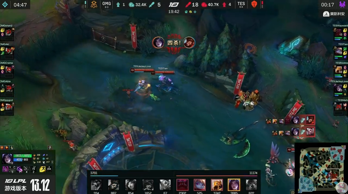 OMG之前就因为还在玩被削弱到已经没人玩的明烛,连输2把给LNG,今天第二局又是因为玩明烛输给了TES。第三局在明明有更好的硬辅选择情况下,最后选出了霞洛。结果最终被Jackeylove的招牌,也是自己拥有冠军皮肤的卡莎直接打烂了。