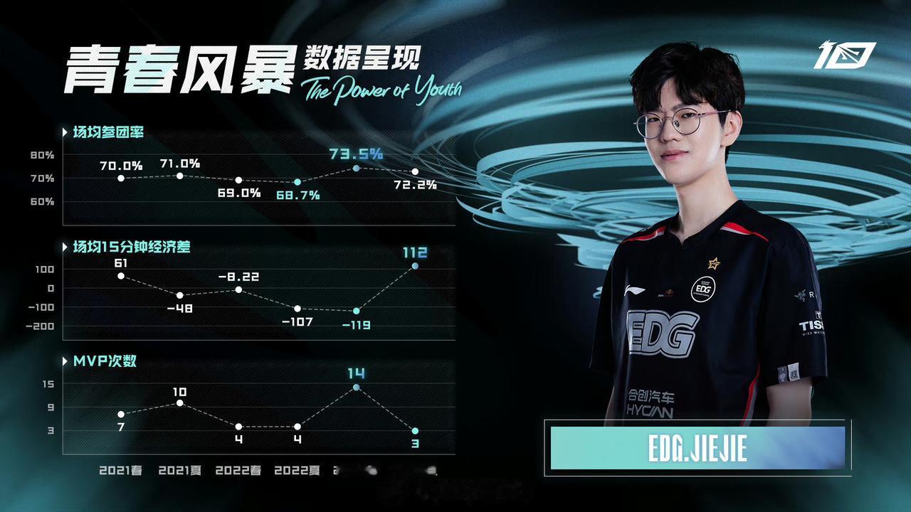 2019年,Jiejie以EDG次级联赛开始职业选手生涯,仅仅只用数月便以出色发挥,调入一队并在同年LPL夏季赛中亮相。在随后两年的LPL生涯中,他逐渐坐稳EDG主力打野位置,作为节奏型打野他拿下不少MVP,但似乎总难与队伍获得更多的荣耀。然而,在2021年EDG阵容完成最终补强后,他与EDG随即在这一年踏上“银龙骑士登顶之旅”。在S11的舞台上,EDG鏖战满5个BO5,连克两支LCK强敌,他自己则砍下7场MVP,也是此届系列赛获得MVP最多的选手。所谓不鸣则已一鸣惊人,便是他的最好写照。