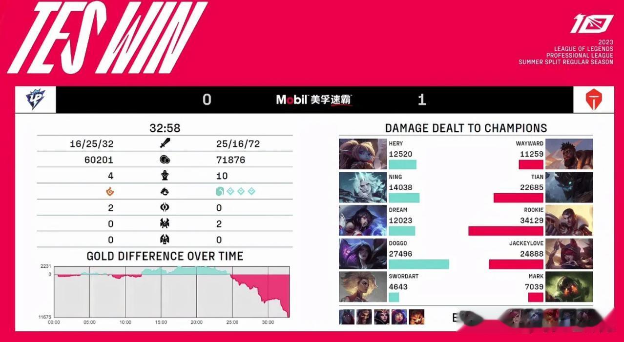 恭喜TES首局战胜UP拿到赛点,大概率提前锁定季后赛六强席位,感觉第一局TES和UP都有好多失误,不过TES整体表现更好一些,Rookie杰斯打出全场最高输出,宁王真是一路追着杰克。