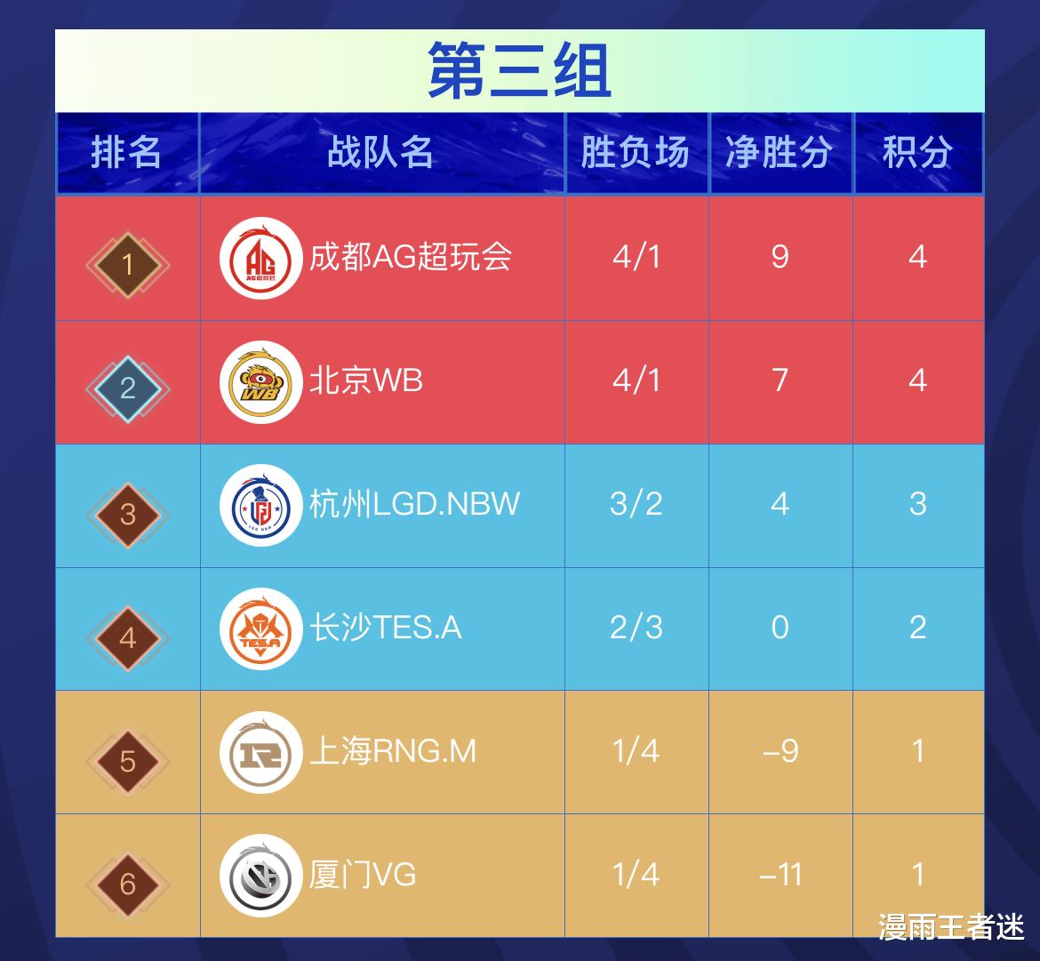 那么原三组的实力相比于原一二组,到底差了有多少呢?而今,常规赛第2轮首周的比赛已经圆满结束了,刚好原三组的6支战队都完成了首秀。然而,这原三组这6支战队中,仅仅只有RNGM获得了首胜,其他队伍无一例外全部都输了。AG超玩会面对TTG2比3憾负、TES1比3不敌KSG、WB2比3不敌狼队、LGD.NBW0比3惨败hero久竞。而RNGM之所以能够获得首胜,那是因为他们的首战的对手是原三组的VG。RNGM跟VG这一战是原三组的内战,不是RNGM赢就是VG赢。这要是并非内战,说不定三组要直接全军覆没。