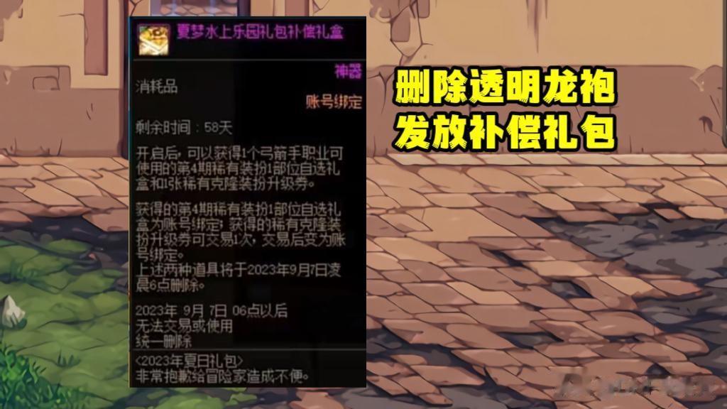 删除通过Bug获取的透明龙袍,发放补偿礼包,内含“第4期天空自选券1张(账号绑定)”和“稀有克隆装扮升级券1张(可交易1次)”。这个补偿,相当于“局部回档”,对大家应该没有影响。