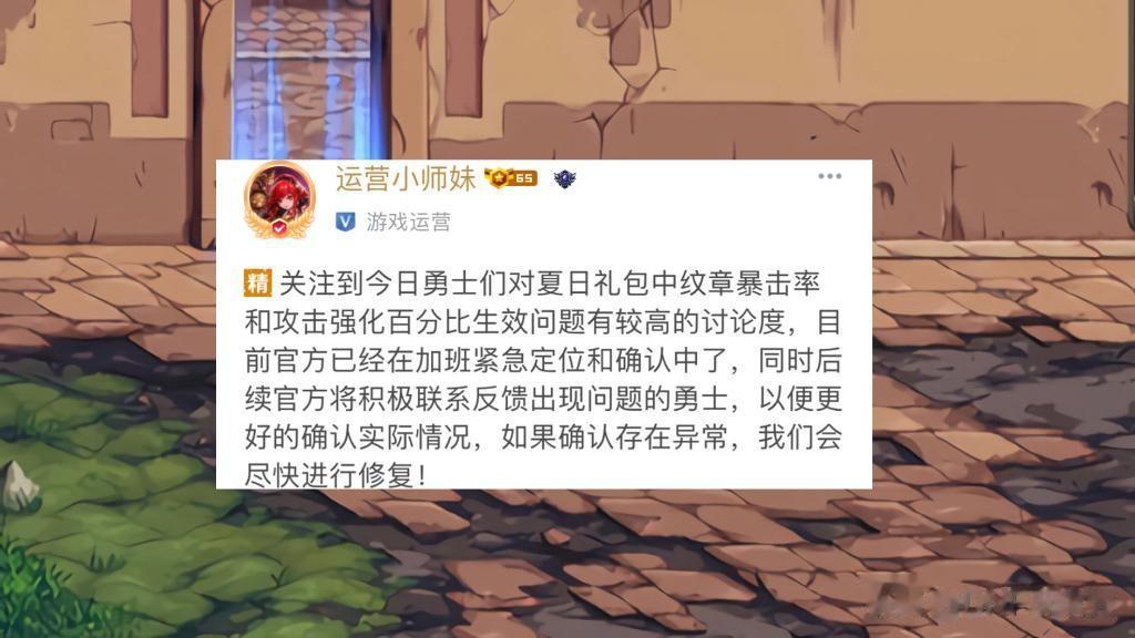 对于这个Bug,运营小师妹曾在助手发布动态称,“关注到勇士们,对夏日礼包中纹章暴击率和攻击强化百分比生效问题,有较高的讨论度,目前官方已经在加班紧急定位和确认中了,同时后续官方将积极联系反馈出现问题的勇士,以便更好的确认实际情况,如果确认存在异常,我们会尽快进行修复”。