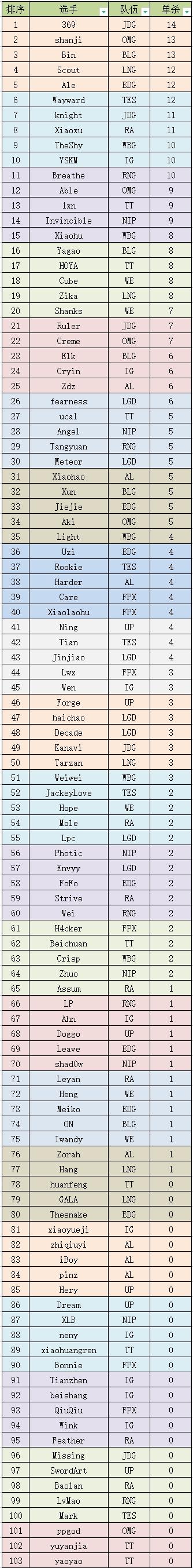 本次单杀榜前十名被上单选手霸榜,有八名上单选手入榜,其中369以14次单杀位列榜首,Shanji和Bin以13次单杀紧随其后,Ale和Wayward 12次单杀。