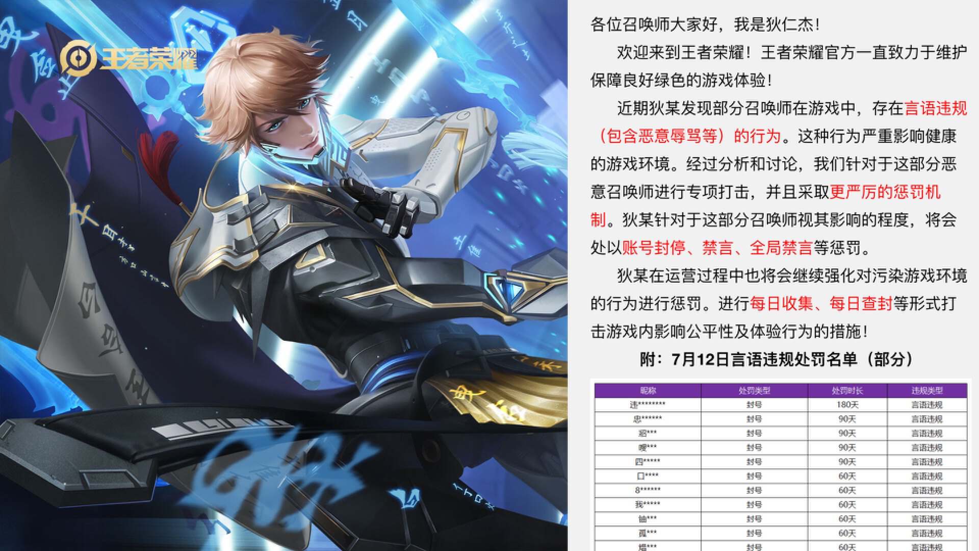目前官方已经公布了部分名单,也就是语言违规导致封号的名单,最低的封号时间是30天,根据目前的数据来看,有一位玩家被封号180天,也是在本次名单中封号最长时间的一位。