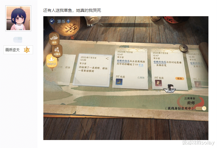 在《逆水寒》手游中,有个离线游历机制,你在游戏中下线,你的角色却还在江湖中游历,本来这是《逆水寒》手游里“殊途同归”机制的一部分嘛,即使下线还能获得经验、货币,但是这功能却被这届网友玩出花来了!