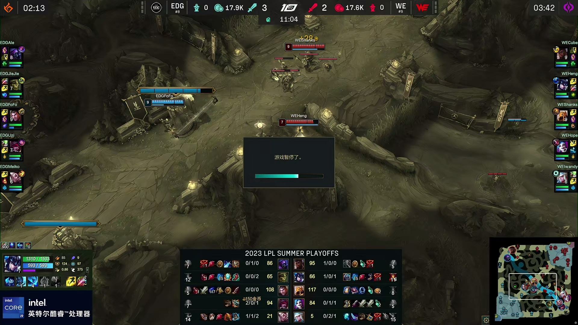 直播吧07月20日讯今日LPL夏季赛EDG对阵WE的首局比赛正在进行中,而本场的第十一分钟出现了季后赛的首次暂停。随后官方直播间也通告本次暂停的原因:Uzi反映了一个游戏内音效问题。