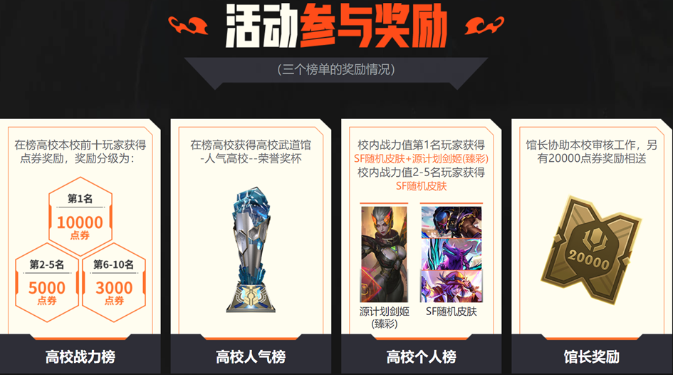 而活动结束后,每个省份积分排名前3000的玩家都是能获得额外奖励,臻彩,至臻以及限定皮肤,具体可以见下表,而网吧、高校阵地则是有单独的活动机制以及奖品,剑姬的源计划臻彩皮肤就是专属奖励,包括还有点券赠送,对于在校玩家来说,多少还是具有吸引力!