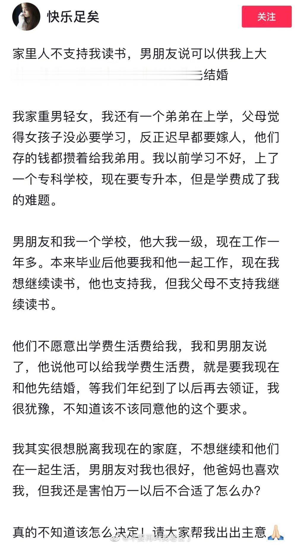 男朋友愿意供我上学,唯一的要求是先和他结婚,怎么办?