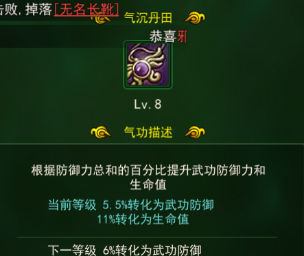 气沉丹田;根据防御力总和的百分比提升武功防御力和生命值!
