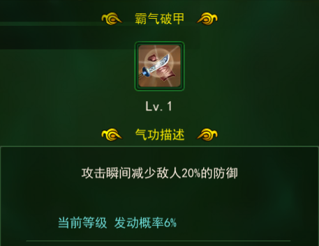 二转:霸气破甲;攻击概率减少目标20%百分比防御“