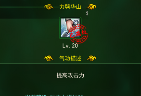 1~21级我们有20气功点,大佬玩家可以不用选择点力壁华山,因为20点攻击伤害对于大佬玩家有点低,对于平民玩家来说可以选择点满!