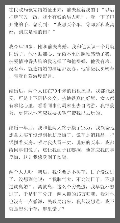 两个人大吵一架后,我说要是不买车,日子没法过了,没想到他说:“我脾气大,不会过日子,不想过就离婚”,离就离,这么个穷光蛋,我早就不想过了,于是和平分开,两人攒的15万归我,我对他也没有一点感激,民政局出来,我都没想通,我不就是想买个车,哪里错了?