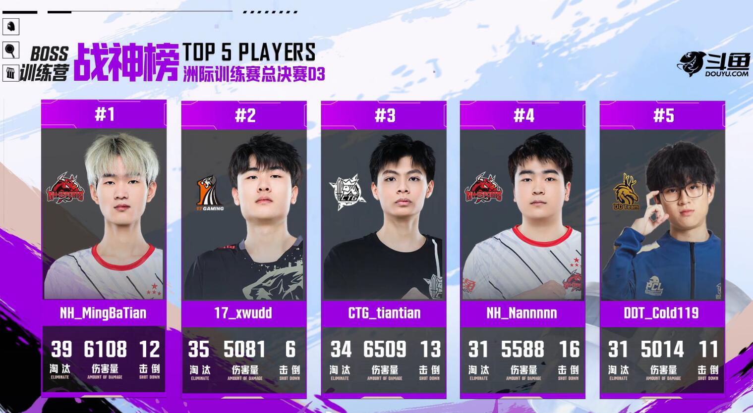 随后是登上战神榜的5位选手,NH的明明以39个淘汰和高达6108点的伤害成功来到第一名,不愧是明霸天,同时队友南南以31个淘汰位列第4。第二位是17战队的小五,淘汰数35个,伤害量刚好达到5000,第三名和第五名分别是CTG的tiantian和DDT的Cold119,这些都是PCL赛区的老选手了,不知道今年下半年的联赛会不会挖掘出比较有潜力的年轻选手。