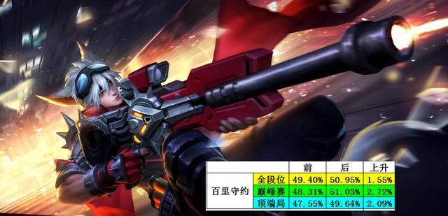 更新后的百里全段位胜率上升了1.55%,巅峰赛胜率上升了2.72%,顶端局胜率上升了2.09%,全段位和巅峰赛胜率都超过了50%,虽然顶端局没有到50%,但也摆脱了垫底层的地位,总体来说这波调整对于百里守约来说是有效果的,但他的优先级依旧不是很高。