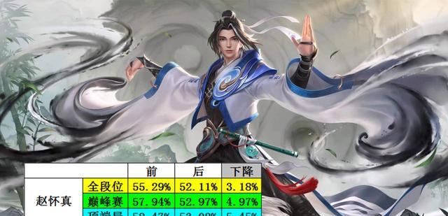 至今为止,赵怀真全段位胜率下降了3.18%,顶端局胜率下降了4.97%,顶端局胜率下降了5.45%,看起来他的胜率下降了非常多,但他的基数高,这就使得他胜率即使降低了非常多,也还保持在一个高胜率的表现,自己也玩过几局削弱后的赵怀真,强度是不如从前,但依旧在强势英雄的范畴,拿他上分还是没有问题的。