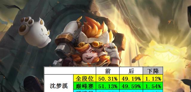 目前沈梦溪在全段位的胜率下降了1.12%,巅峰赛胜率下降了1.54%,顶端局胜率下降了1.24%。可惜的是沈梦溪的登场率也下降了一些,总体来说,削弱了沈梦溪最赖以成名的2技能,对沈梦溪的影响还是非常大的。