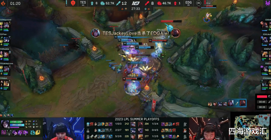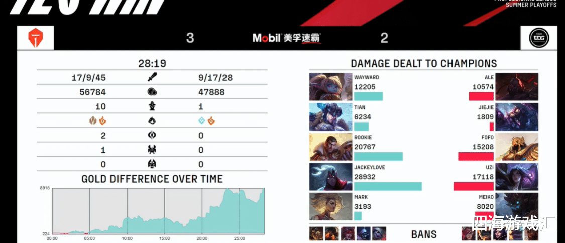 在今天这场针尖对麦芒的比赛中,本以为仁川人与RNG名宿的对决是今日比赛的看点,但没想到UZI与JKL的对决却是呈现了一边倒的局势。在下路放置了无数的资源来帮助UZI的EDG并没有获得应有的回报,团战碰撞中的UZI几乎没有什么作为。在最后一局中队友让的人头也没能拿下,经济最好的UZI也总是团战的最开始,在缺少输出的情况好,Ale和fofo发挥再好也难以拿下比赛。