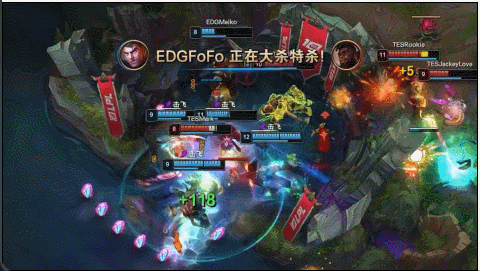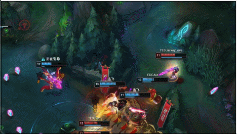 13分钟EDG再一次在野区抓到了芮尔完成击杀,优势对局下双方争夺先锋过程中,Ale锤飞一人正面EDG开团但一个人没杀掉,芮尔闪现进场配合Rookie大招直接推死Uzi,后续团战追击EDG被逐个击破,TES打出团灭一波逆转局势。