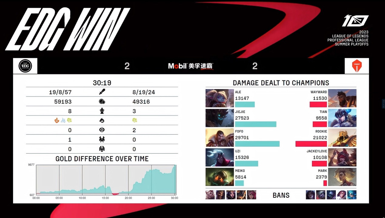 中期处理不佳被团灭的情况下EDG连打出两波团灭,奠定优势后顺利拿下比赛胜利。