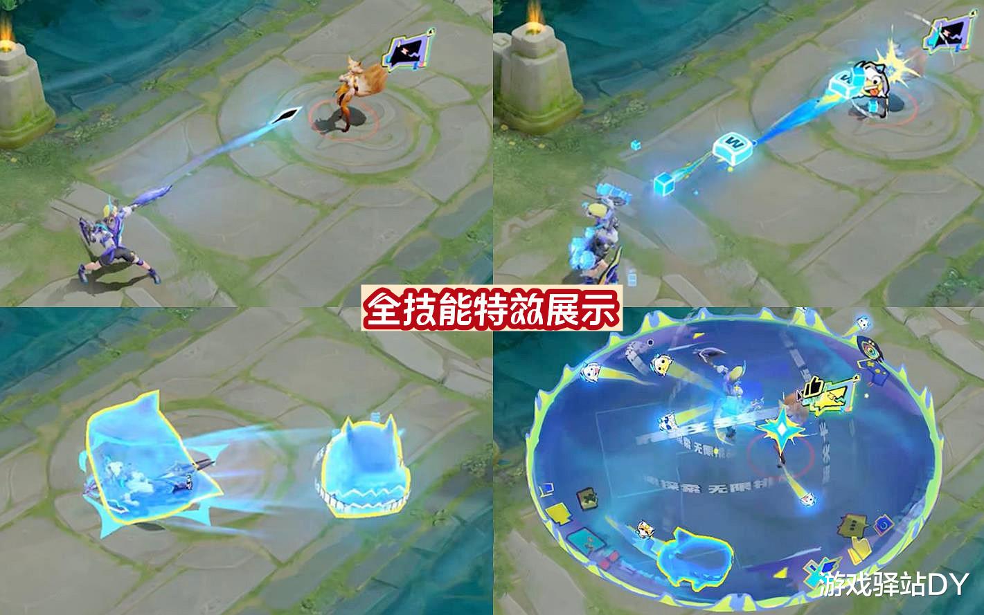 马可波罗——妄想实况的局内特效创意十足,其中普攻子弹变成空间裂缝,被动的破坏防御效果则以小怪兽对话框的形式展现,随着被动叠加,小怪兽会被蓝绿色填满。一技能的子弹变成了游戏主播经常用到的四个冰蓝色字母按键“WASD”,且命中目标还有各种搞笑的表情包掉落;二技能位移时原地和落点位置都有怪兽虚影出现;大招特效很给力,视觉效果拉满,在蓝绿色范围光效中,出现弹幕和表情包飞溅的效果,当然最有趣的还是小怪兽绕圈奔跑。
