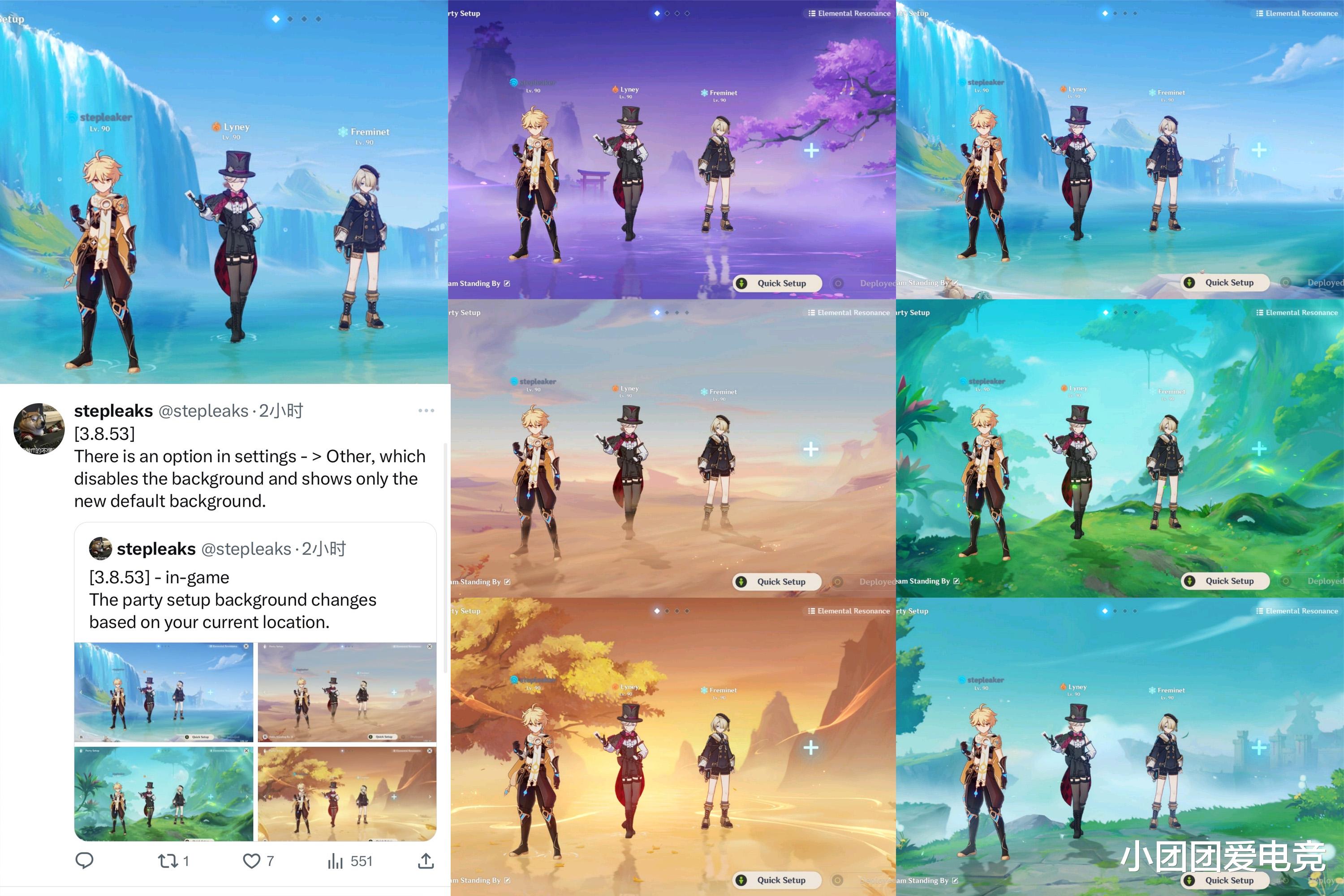 各位大佬好呀!4.0队伍编成界面一览,编队界面背景会根据所在位置而变化,背景风格包括须弥(雨林、沙漠),枫丹,稻妻和蒙德!这次优化还是不错的,起码降低审美疲劳了,感觉还可以在版本活动和过节日时加入彩蛋!不过老米有精力搞这个咋不把换队读条取消了,或者加快切换队伍的进度条速度呢?