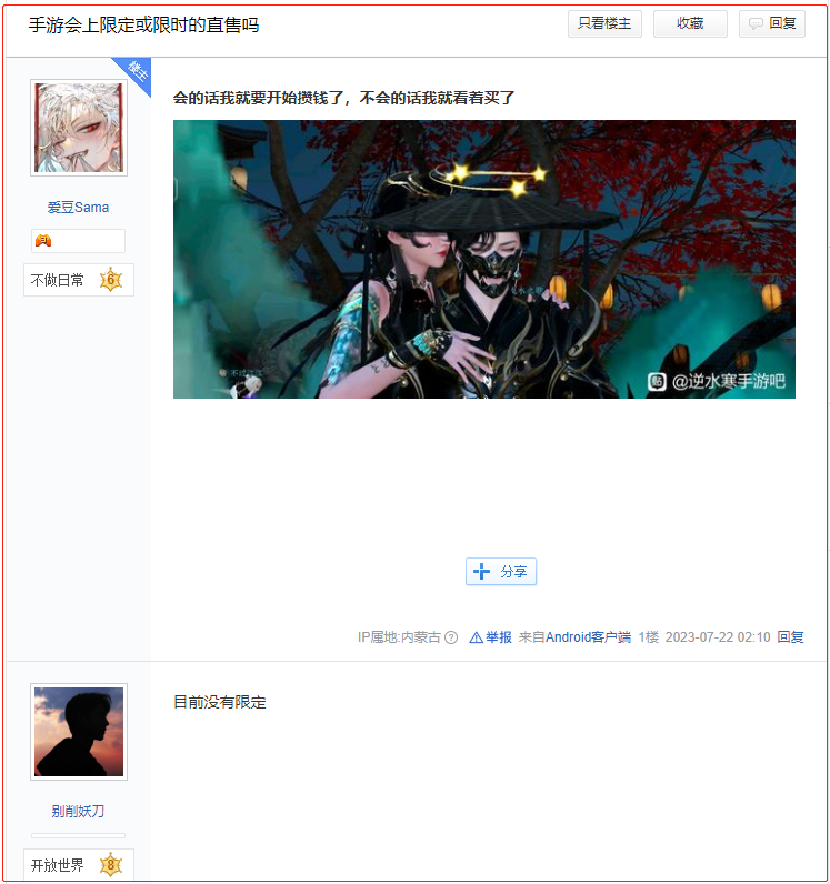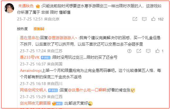 因为限时限量时装巨大的商业价值,因此很多MMO玩家都养成了“投资理财”的习惯,自己在玩的游戏只要出了限时限量时装,都会入手一两套坐等升值。而这些玩家在刚接触《逆水寒》手游的时候,却意外的发现,这款游戏并不搞限量!